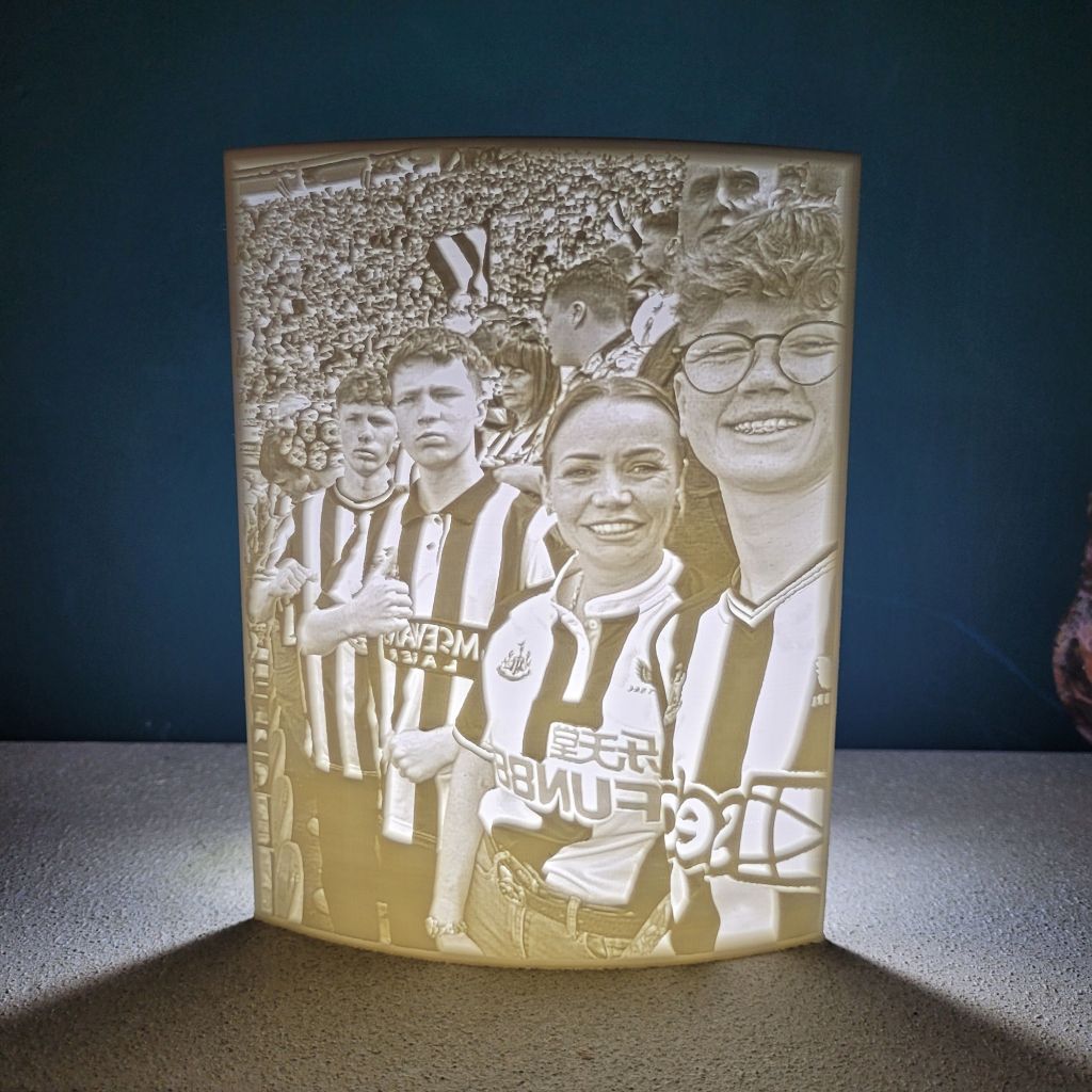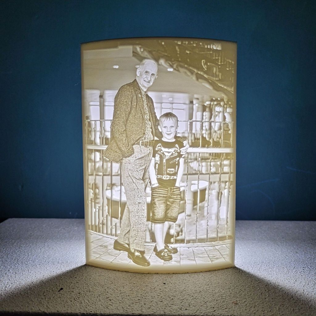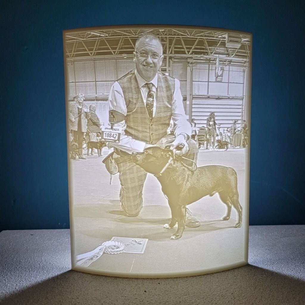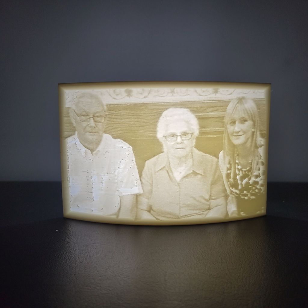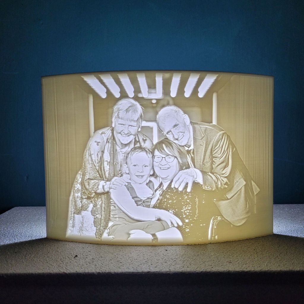 Coming in a variety of sizes on request, lithophanes are designed to show a picture when light is shone through from behind. This can be sunlight, a lamp or an LED light – the last of which can be supplied with any orders!
